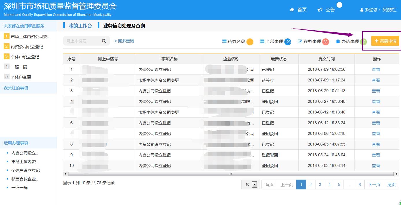 登錄之后界面如下。在頁面的右上角找到“我要申請”背景為黃色的選項: