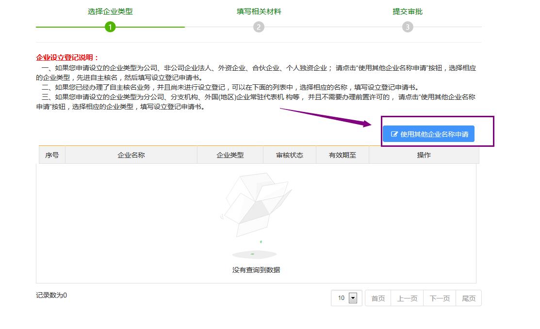 點擊“辦理”之后,跳轉(zhuǎn)到下面的界面,可以先閱讀一下企業(yè)設(shè)立登記說明;然后點擊頁面右上角“使用其他企業(yè)名稱申請”,如下圖: