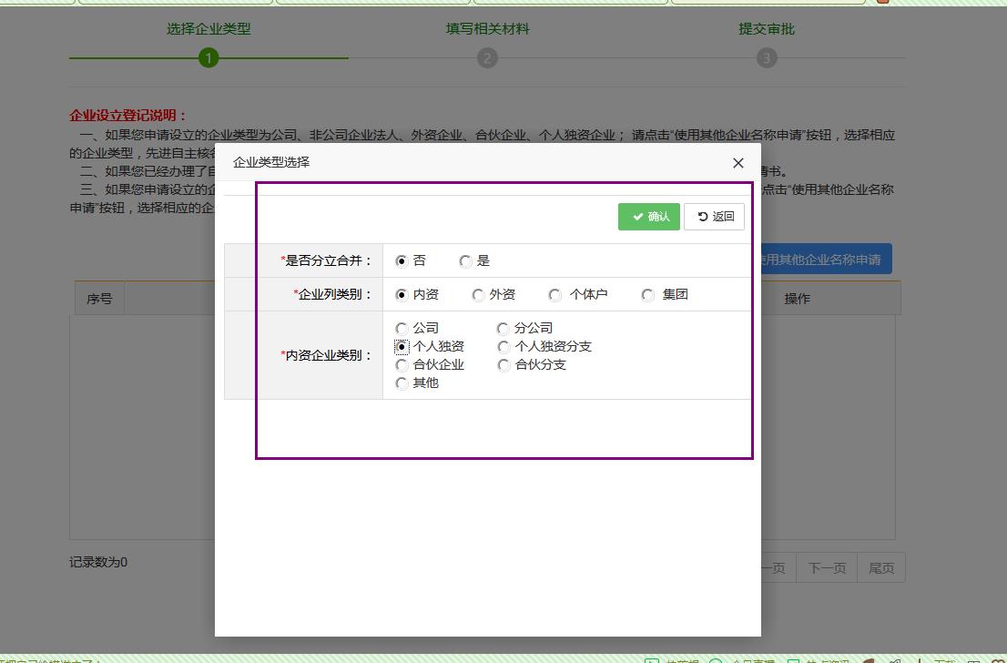 選擇之后會彈出一個“企業(yè)類型選擇”的彈窗;選擇好自己企業(yè)的類別,然后點擊確認(rèn):如下圖: