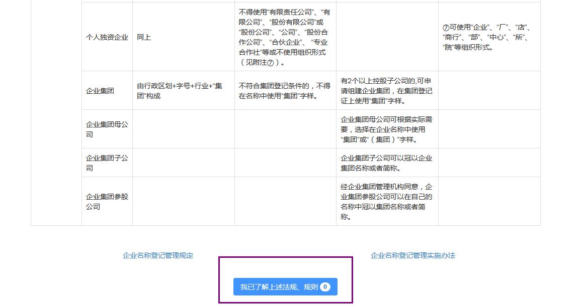 點擊確認(rèn)之后,跳轉(zhuǎn)企業(yè)名稱自主申報規(guī)則頁面;一般都是一些關(guān)于公司名稱,公司成員,公司形式的要求,可以閱讀一下,也可以直接點擊最下面“我已了解上述法規(guī),規(guī)則”(注意:系統(tǒng)會有一個21秒的閱讀時間,在這個時間內(nèi)是無法點擊五一了解上述法則,法規(guī),等待21秒過完即可)如下圖: