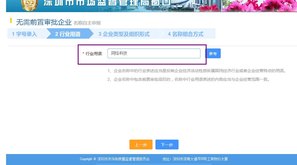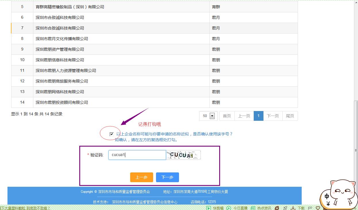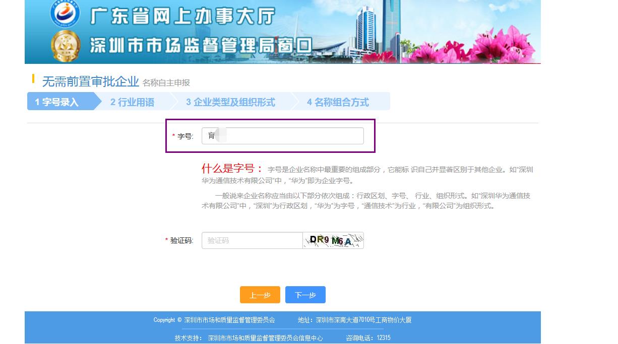 接下來是非常重要的一步,“公司核名”,將你準(zhǔn)備好的公司名稱輸入你的字號就可以。無需輸入公司全稱。(注意,公司名稱的組成形式為:“深圳市”+“字號”+“行業(yè)”+“有限公司”)在輸入框只需要輸入你的公司字號就可以。然后輸入驗證碼,點擊下一步,如下圖