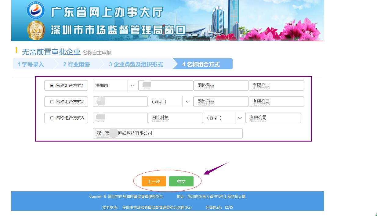 下一步該恭喜你一下,你的公司名稱是可以用的,你要選擇一下你比較滿意的名稱組合方式,系統(tǒng)會給你列出所有的公司名稱組合方式供你選擇,選擇好之后,點擊提交,如下圖: